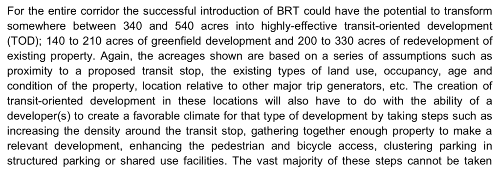 In order for BRT to become a reality alongside the Comp Plan stated goal of densification along the corridors, the need for the current study was born — “as a prototype for developing a comprehensive transportation and land use corridor plan.” A plan that will have a “detailed regulatory framework” for implementation “including site-specific land use recommendations and corridor-based design guidelines and/or standards.” These stated goals will impact the future of our Neighborhood, and it is important that we inform ourselves about all of the aspects of this study and make note of our preferences regarding the outcome.