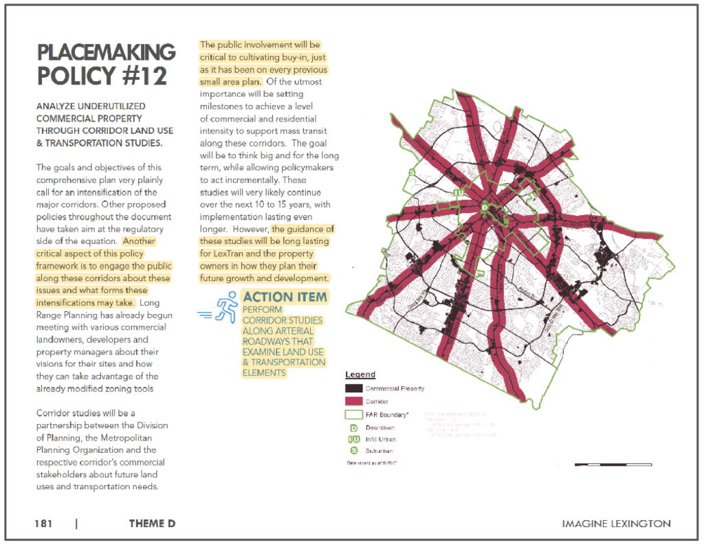 Lexington’s new Comprehensive Plan, adopted in 2019, calls for the incremental densification of the major road corridors into and out of Lexington.