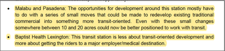More intense development is recommended around the BRT station stops. This is known as transit-oriented development (TOD). In the 2014 study, the two proposed BRT transit stations nearest to Southern Heights are at Malabu and Pasadena and at Baptist Health, although the Baptist Health transit station is not a focus for transit-oriented development.