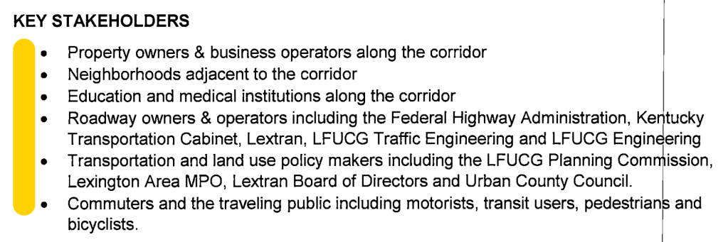 The SHNA decided to dedicate one of our web pages to this important study due to the inevitable impact on our neighborhood. Funded in November 2019 for $222,000, this study has been recently publicized as “Imagine Nicholasville Road.” It began with a kick-off in November of 2019 and is scheduled to conclude with final products delivered by December 31, 2020. Facilitating public and stakeholder engagement is one of the stated purposes of the project, and neighborhoods adjacent to the corridor are listed second among the Key Stakeholders.