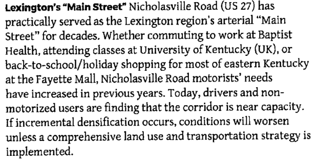 This densification, in turn, requires the need for a comprehensive corridor plan. The 2019 US 27 / Nicholasville Road Coordinated Land Use Plan and Transportation Study is designed to meet that need and serve as a prototype for future corridor studies.